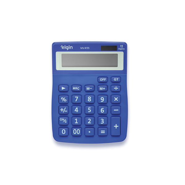 A Calculadora Elgin MV 4125 Azul e uma opcao pratica e funcional para quem precisa de precisao nos calculos do dia a dia. Com 12 digitos, ela e ideal para escritorios, empresas e uso pessoal, permitindo realizar operacoes como soma, subtracao, multiplicacao, divisao e calculos de porcentagem de maneira eficiente e rapida. As Calculadoras de Mesa da Elgin funcionam com energia solar e bateria, quando a iluminacao do ambiente e boa, a celula solar atua simultaneamente com a bateria reduzindo seu consumo de energia, prolongado assim sua vida util. Sao diversos modelos com funcoes como Inversao de Sinais, Raiz Quadrada, Correcao Total, Grande Total, Tecla Duplo Zero, Mark Up e ate Memoria de Passo, que permite a checagem e correcao de ate 120 passos sem cancelar a operacao atual e automaticamente corrigir o total.