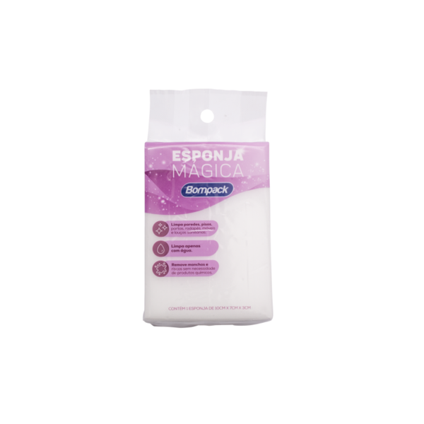 A Esponja Magica Bompack e a aliada poderosa para remover manchas e sujeiras dificeis de varias superficies. Esta esponja e projetada para limpar sem a necessidade de produtos quimicos agressivos. Basta umedece-la e aplica-la suavemente para ver as manchas desaparecerem. Seu poder de limpeza surpreendente e eficaz em paredes, moveis, eletrodomesticos e muito mais. Simplifique suas tarefas de limpeza com a Esponja Magica Bompack, onde limpeza eficaz e facilidade de uso se encontram para criar um ambiente impecavel.