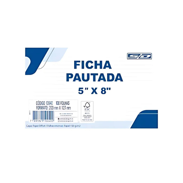 A Ficha Pautada 5x8 SD 10040 203mm x 127mm C/100 e perfeita para quem precisa de um registro organizado e pratico no dia a dia. Com 100 folhas de alta qualidade, cada ficha possui pautas que facilitam a escrita de forma clara e ordenada. Com o tamanho de 203mm x 127mm, oferece um espaco ideal para anotacoes, listas e registros, sendo perfeita para escritorios, escolas e outros ambientes que exigem praticidade e eficiencia.
