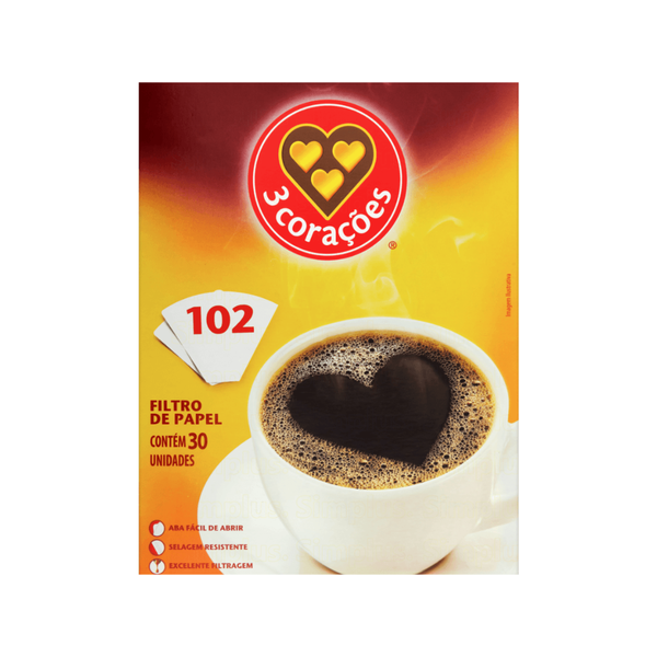 O Filtro de Papel 3 Coracoes 102 e ideal para preparar cafe com praticidade e eficiencia. Cada embalagem contem 30 unidades, e o filtro e compativel com cafeteiras que utilizam o tamanho 102. Fabricado com papel de alta qualidade, o filtro retem as impurezas do cafe, garantindo uma bebida limpa, sem residuos, e com sabor mais puro.