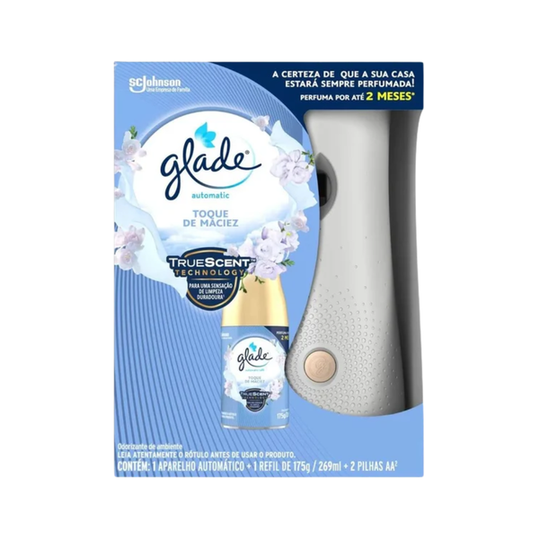 O Glade Automatic Aplicador, Refil e Pilha Toque de Maciez 269ml e um kit completo que inclui o difusor automatico, um refil de 269ml com a fragrancia suave de Toque de Maciez, e uma pilha para o funcionamento do aparelho. Este refil libera um aroma delicado e acolhedor, criando uma atmosfera agradavel e perfumada de forma continua e automatica. Ideal para ambientes como salas, quartos e banheiros, o difusor mantem o espaco perfumado sem a necessidade de intervencao manual. Pratico e eficaz, e perfeito para quem busca um frescor constante e uma sensacao de conforto no ambiente.