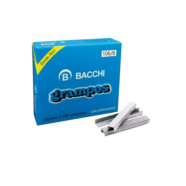 O Grampo Bacchi Galvanizado 106/8 e uma embalagem contendo 2500 unidades de grampos do tipo 106/8, fabricados em aco galvanizado. Esses grampos tem uma maior resistencia a corrosao, o que aumenta sua durabilidade. Sao ideais para grampeadores de tamanho compativel e sao usados para prender papeis, cartolinas ou outros materiais de gramatura media. A embalagem com 2500 unidades oferece uma solucao economica para ambientes que necessitam de grampos em grande quantidade, como escritorios, escolas e empresas. A alta resistencia do material tambem garante maior eficiencia no uso diario.