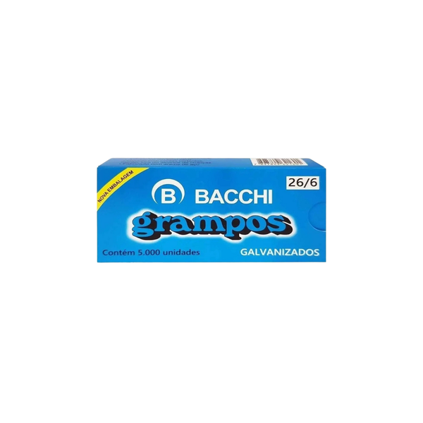 O Grampo Bacchi Galvanizado 26/6 e uma embalagem contendo 5000 unidades de grampos tamanho 26/6, feitos em aco galvanizado, o que proporciona maior resistencia e durabilidade, alem de proteger contra a corrosao. Esses grampos sao ideais para grampeadores de tamanho compativel e sao usados para prender folhas de papel de forma pratica e eficiente, sendo muito comuns em escritorios, escolas e outros ambientes de trabalho. A embalagem com 5000 unidades oferece uma opcao economica e de longo prazo para quem utiliza grampos com frequencia.