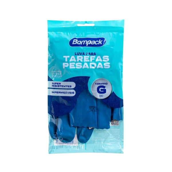 A Luva de Verniz Bompack na cor azul, tamanho G (1 par). Fabricada pela confiavel Bompack, proporciona resistencia e durabilidade, enquanto o acabamento em verniz confere um toque de elegancia. Ideal para diversas aplicacoes, desde limpeza domestica ate atividades que demandam um toque mais refinado. Escolha a Luva de Verniz Bompack para garantir seguranca e um visual diferenciado nas suas maos. O par de luvas azuis, tamanho G, e a escolha perfeita para quem busca estilo aliado a protecao.