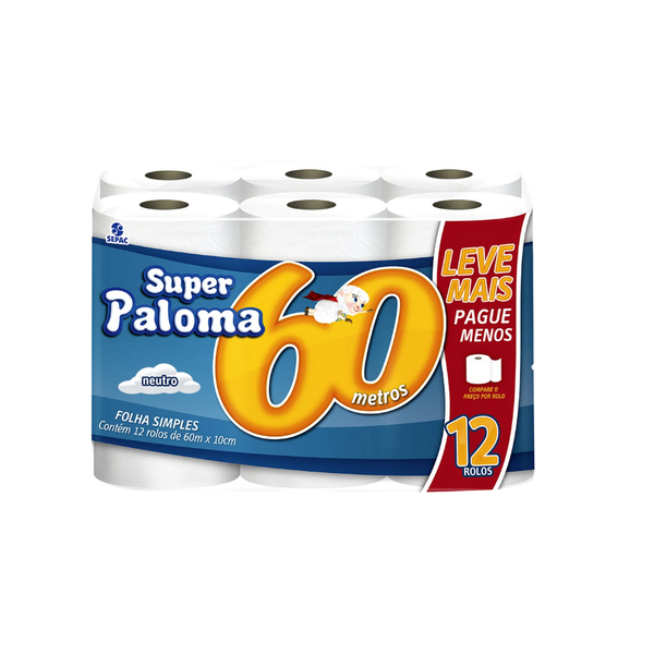 O Papel Higienico Paloma Folha Simples e uma embalagem contendo 12 rolos de papel higienico de folha simples, com 60 metros de comprimento cada. Ideal para uso domestico e em estabelecimentos comerciais, esse produto oferece uma boa performance de limpeza e maciez, sendo economico e de facil manuseio. A folha simples e pratica, proporcionando maior rendimento por rolo. A embalagem com 12 unidades e uma opcao conveniente para quem busca praticidade e economia no uso diario.