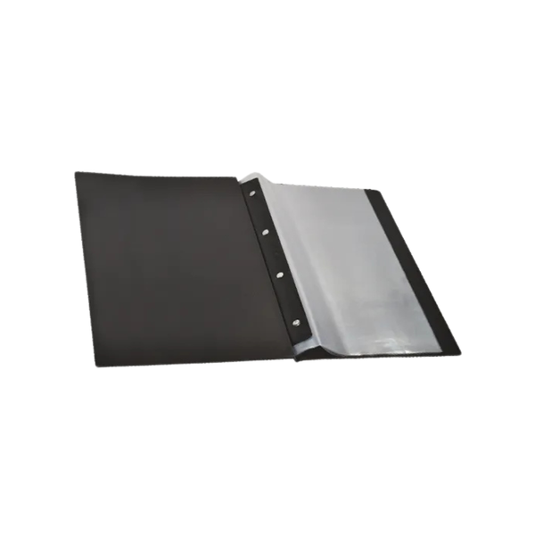 Pasta catalogo Preta em PVC, vem com 10 envelopes plasticos finos, tamanho oficio e fixacao por 4 colchetes permitindo ajustar a quantidade de plasticos.