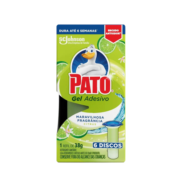 O Pato Gel Adesivo Refil Citrus com 6 Discos e um produto de limpeza para vasos sanitarios, que proporciona frescor e elimina odores. A embalagem contem 6 discos adesivos com gel, que liberam um aroma citrico, deixando o banheiro com uma fragrancia refrescante e agradavel. Esses discos sao de facil aplicacao e aderem bem ao vaso, proporcionando uma limpeza continua e duradoura. Alem disso, ajudam a evitar o acumulo de sujeira e oferecem praticidade no cuidado diario do banheiro, mantendo-o sempre limpo e perfumado. Ideal para quem busca uma solucao eficiente e conveniente para a higiene do ambiente.