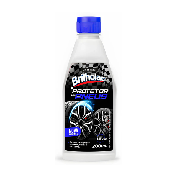 O protetor de pneu e para-choque Brilholac limpa, protege e da brilho em pneus, para-choques, painel, borrachas, vinil e todas as partes pretas de veiculos.