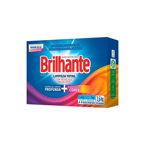 O Sabao em Po Brilhante Limpeza Total 1.6kg oferece uma limpeza eficaz e completa para suas roupas, removendo sujeiras e manchas de forma pratica. Sua formula foi desenvolvida para proporcionar alta performance em qualquer tipo de lavagem, garantindo resultados impecaveis e roupas mais limpas e frescas. Ideal para uso diario, o produto e economico, ja que a caixa de 1.6kg garante varias lavagens.