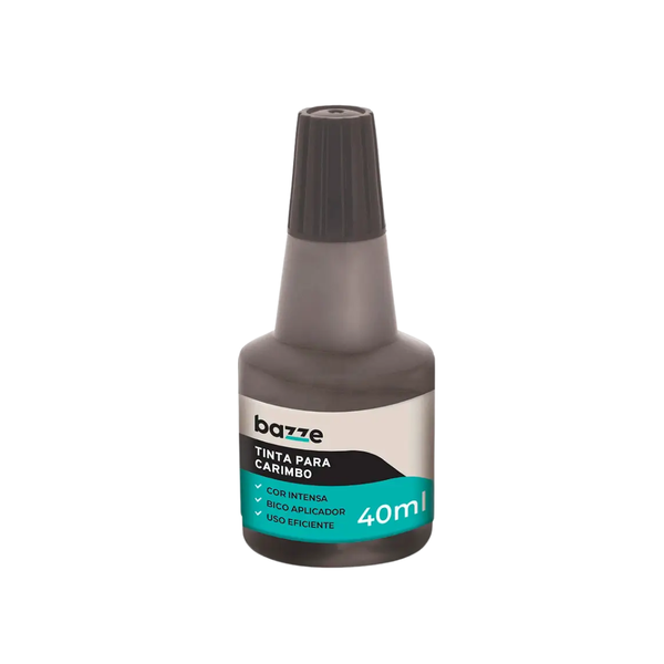 Tinta para carimbo Bazze na cor preta, ideal para uso em escritorios, comercios e ambientes administrativos. Proporciona impressao nitida, uniforme e de secagem rapida, garantindo excelente visibilidade dos carimbos. Compativel com carimbos automaticos e almofadas entintadas. Frasco de 40ml com bico dosador que facilita a aplicacao, evita desperdicios e mantem o rendimento do produto. Ideal para uso frequente no dia a dia profissional.