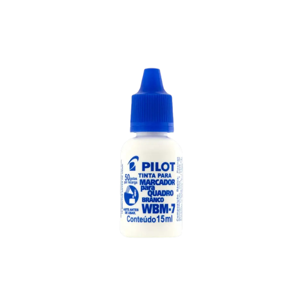 A Tinta para Marcador de Quadro Branco WBM-7 e uma formula desenvolvida sob medida para o Marcador de Quadro Branco WBM-7 da PILOT. Com propriedades cuidadosamente selecionadas, essa tinta e projetada para manter e prolongar as qualidades excepcionais do seu marcador, durabilidade e garantindo uma escrita suave e marcante . Poucas gotas sao necessarias para a recarga, de forma que 50 gotinhas realizam uma recarga completa do WMB-7.